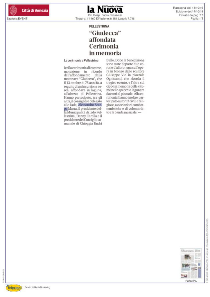 Il 13 ottobre di 75 anni fa, a seguito di un’incursione aerea, affondava in laguna, all’altezza di Pellestrina, la motonave “Giudecca”. La cerimonia di commemorazione delle vittime si è svolta stamattina sul sagrato della chiesa dell’isola, alla presenza del consigliere delegato alle isole, Alessandro Scarpa ‘Marta’, del presidente della Municipalità di Lido Pellestrina, Danny Carella e del presidente del Consiglio comunale di Chioggia Endri Bullo.