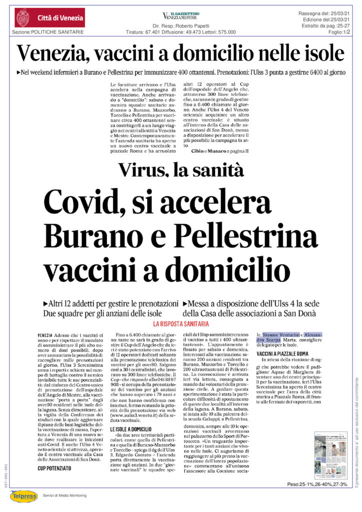 Gazzettino: vaccini a domicilio a Pellestrina e Burano
